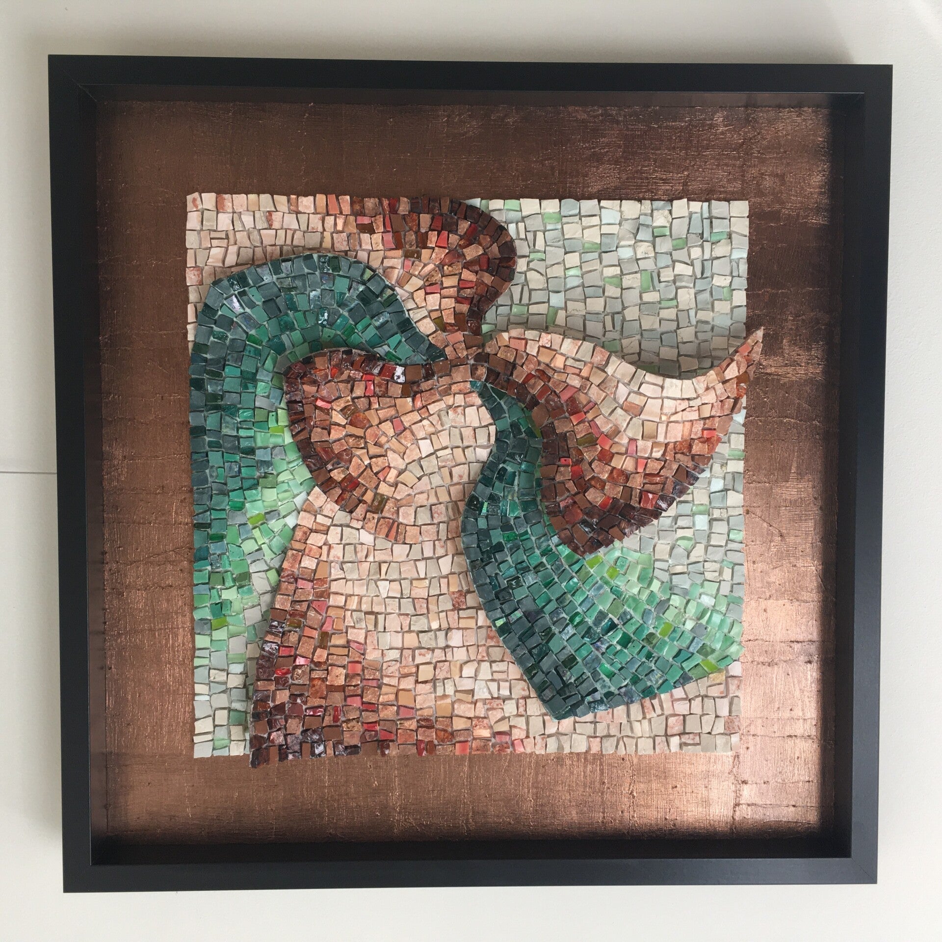 2-D mozaïek op een bewerkte aluminium plaat. Achtergrond van bladkoper en zijde chifon.