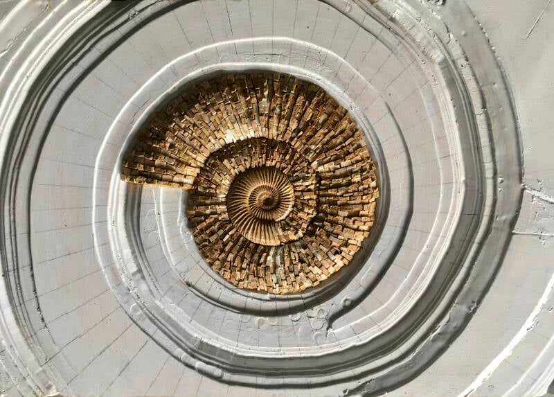 2-D werk met Ammoniet gemaakt uit één kleur marmer. Uitgetekend volgens de wiskundige rij van Fibonacci. Geplaatst op een voorbewerkte gefreesde onderplaat.