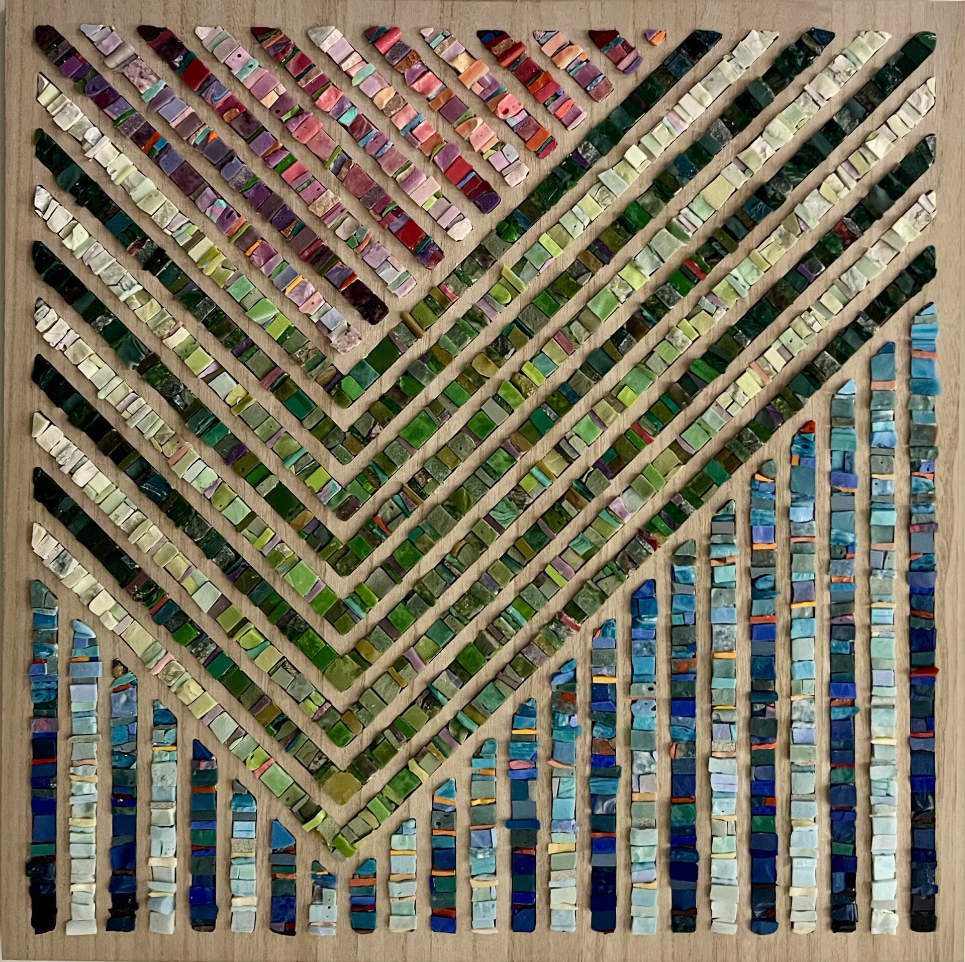 Grafisch werk, waarbij de mozaïek ingelegd is in hout, op- en aflopend van kleursterkte, met contrasterende kleuren voor meer levendigheid. De manier van ophangen geeft steeds een ander effect en beleving.