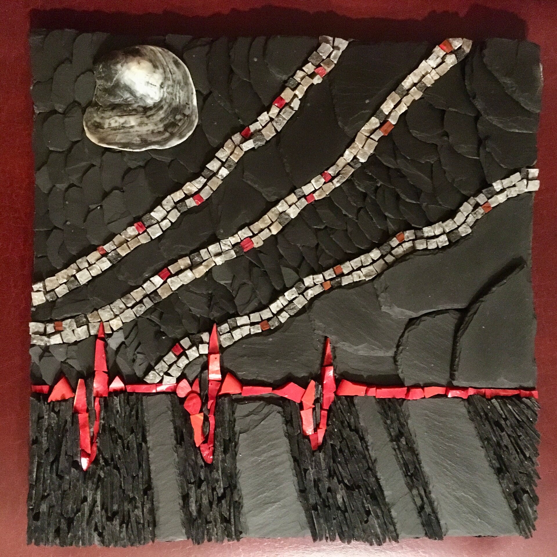 Dit werk omvat veel technieken in leisteen met als rode draad een hartslag.
